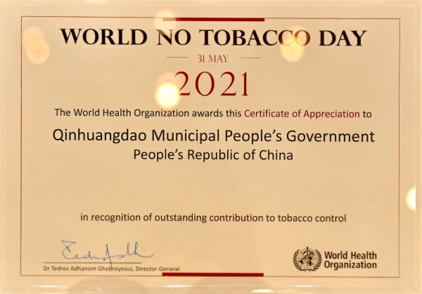 2021年5月31日,世界卫生组织为秦皇岛市政府颁发“世界无烟日奖”